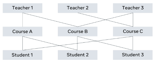 Here’s an example of a network database. A teacher can teach multiple courses and a course can have multiple teachers teaching it.