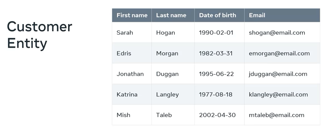 All these fields and rows work together to store information on the customer, also known as the entity.