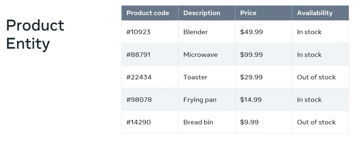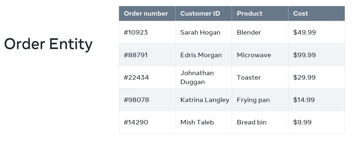 Within a database, this data could be rendered as an order table or entity. The data can be organized into rows that contain: