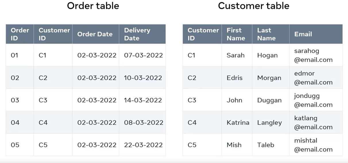 The customer ID is the primary key of the customer table, but it becomes a foreign key in the order table. This way, the relationship is established and the data in these two tables are related.