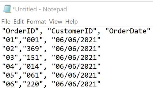 Below is an example of what a flat file database looks like. This text file stores lines of data, where each line represents a record. The fields OrderID, CustomerID and OrderDate are separated by commas.