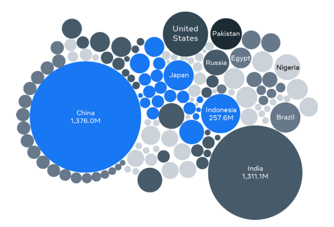 There are large bubbles for China (around 1.4 billion people) and India (about 1.3 billion people), as these countries have the largest populations. Then there are medium-sized bubbles for the USA (about 330 million people) and Indonesia (about 270 million people). Russia (about 145 million people) and Egypt (around 100 million people) have smaller-sized bubbles, as they have smaller comparable populations.Â