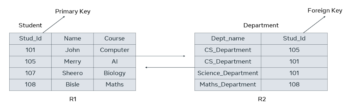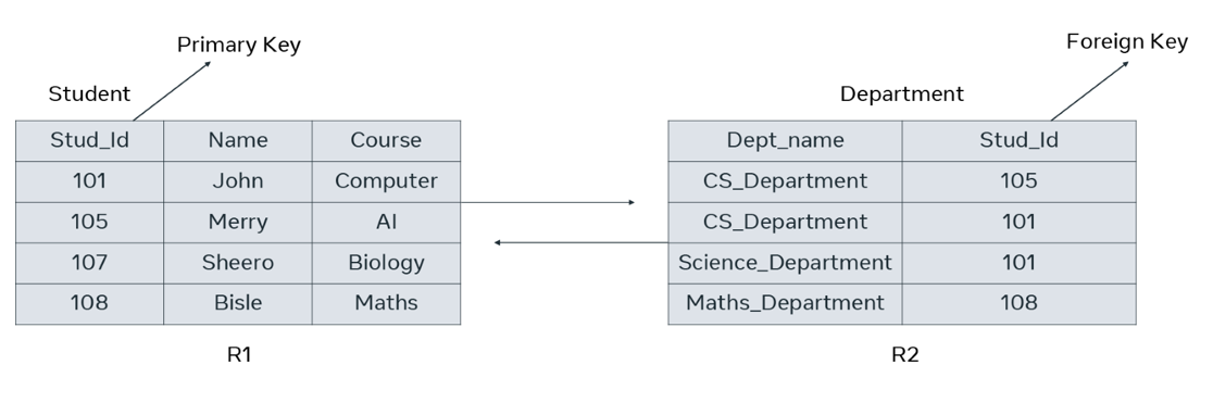 Let’s take the example of a database that contains two tables: student and department. The student table has a primary key of “Stud_id”, which is also present in the Department table as a foreign key. Therefore, the two tables are related to each other via the “Stud_id” field.