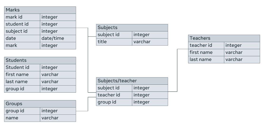 In a relational database there are multiple tables representing the structure of the back end of a software system. For example, in the context of a Student Information System, the tables might include Student, Teacher, Class and Subject.