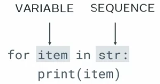 First, you declare a variable called str, which is of type string, recall that a string in Python is a sequence, which means you can iterate over each character in the string. A sequence is just an ordered set.